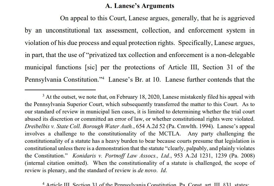 Based on the information provided, Lanese's argument that "privatized tax collection and enforcement is a non-delegable municipal function per the protections of Article III, Section 31 of the Pennsylvania Constitution" is centered on the principle that the power to levy taxes and perform municipal functions generally cannot be delegated to private entities.