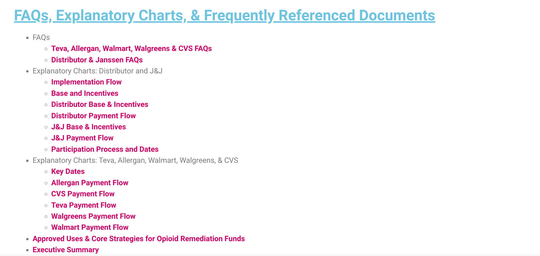 New national opioid settlements have been reached with Teva, Allergan, CVS, Walgreens, and Walmart. This revised and updated website provides copies of these agreements and earlier national opioid settlements with Janssen and distributors Cardinal, McKesson, and AmerisourceBergen, as well as additional documents and information concerning these proposed settlements. The agreements themselves control the terms of the settlements, and entities eligible to participate in the settlements should consult with counsel about participation. The site was created and is maintained by the Plaintiffs’ Executive Committee.