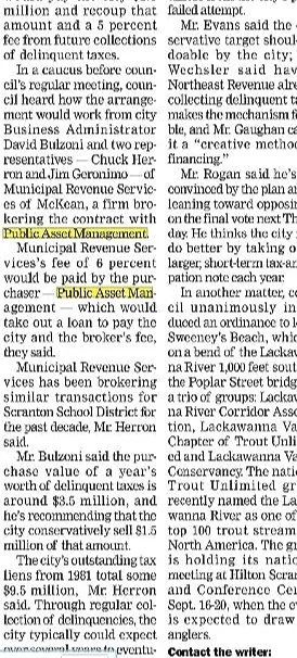 municipal revenue services brokers the assignment of liens from the district to Public Asset manage ment